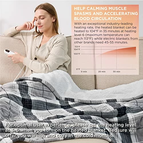 - Stable Heating: Our heated blanket offers industry-leading fast and stable heating with a wider wiring area and improved heating rate. It can be heated to 104Β°F in 35 minutes at heating level 6, while others need 45-55 minutes (up to 113Β°F). PTC/NTC heating wire provides the perfect temperature for comfortable relaxation while ensuring overheating protection.