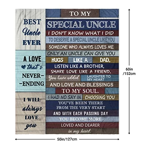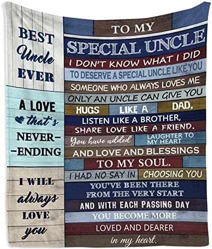 - ๐ใCustom blanketใ:This super soft blanket is specially designed for expressing love between uncle and niece/nephew. The purpose of this throw blanket is not only to bring warmth but also to bring love. A gift from nephew to uncle way for the giver to express love, make him feel warm and loving. Imagine the moment your uncle opens the pack and realizes this is a perfect gift for him!