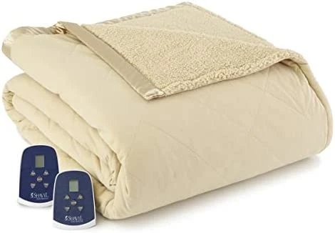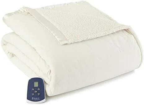 - SATIN-TRIMMED MICRO FLANNEL HEATED BLANKET WITH SHERPA: Quilted sherpa blanket With patented 7 Layers of Warmth; Micro Flannel, down alternative fill, specially-crafted electrical cloth and a quilted layer of heating elements