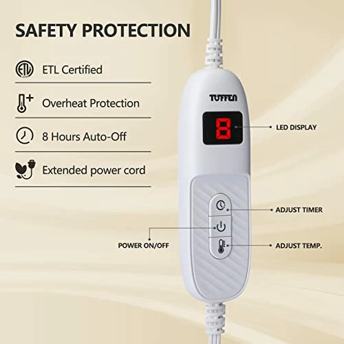 - SAFETY PROTECTION: ETL and FCC certified, Overheat protection and 8 hours auto-off. Multiple protection allows you to enjoy the warmth and comfort of the blanket without any safety hazards. 6.5FT power cord allows you to easily connect to a nearby outlet without tripping your feet.