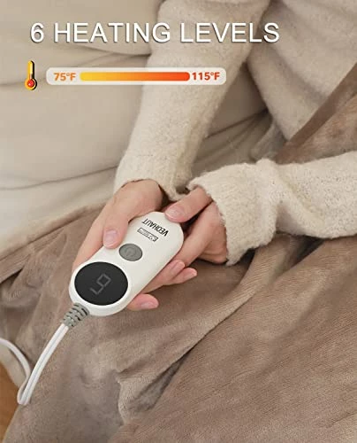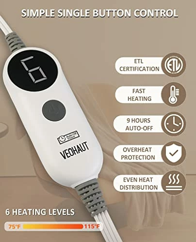 - 6 HEATING LEVELS AND AUTO OFF: The heating blanket has 6 heating levels (75°F-115°F), controlled by a button. It can automatically shut down after 9 hours, and the overheating protection can protect you and the heated blanket, and there is no safety hazard